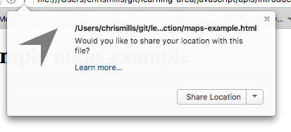 Nota: Cuando cargues por primera vez el ejemplo de arriba, se te mostrará un mensaje preguntando si deseas compartir tu localización con esta aplicación (ver la sección They have additional security mechanisms where appropriate que se encuentra más adelante en este artículo). Deberás estar de acuerdo con esto para poder ver tu localización en el mapa. Si aún así sigues sin ver tu localización, tal vez debas establecer los permisos manualmente; lo puedes hacer de varias formas dependiendo del navegador que estés usando; por ejemplo en Firefox debes ir a > Tools > Page Info > Permissions, y cambiar la configuración para Share Location; en Chrome ve a Settings > Privacy > Show advanced settings > Content settings y cambia las opciones para Location.
