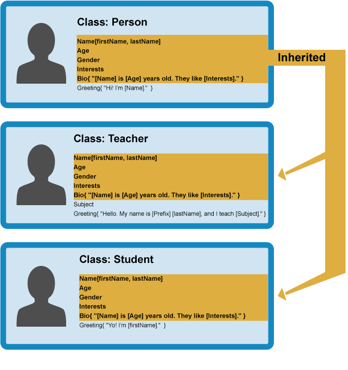 Isso é realmente útil — professores e alunos compartilham muitos recursos comuns, como nome, sexo e idade, por isso é conveniente definir apenas esses recursos uma vez. Você também pode definir o mesmo recurso separadamente em classes diferentes, já que cada definição desse recurso estará em um namespace diferente. Por exemplo, a saudação de um aluno pode estar no formato "Yo, I'm [firstName]" (por exemplo, Yo, I'm Sam), enquanto um professor pode usar algo mais formal, como "Olá, meu nome é [Prefixo [lastName], e eu ensino [Subject]. " (por exemplo Olá, Meu nome é Mr Griffiths, e eu ensino Química).